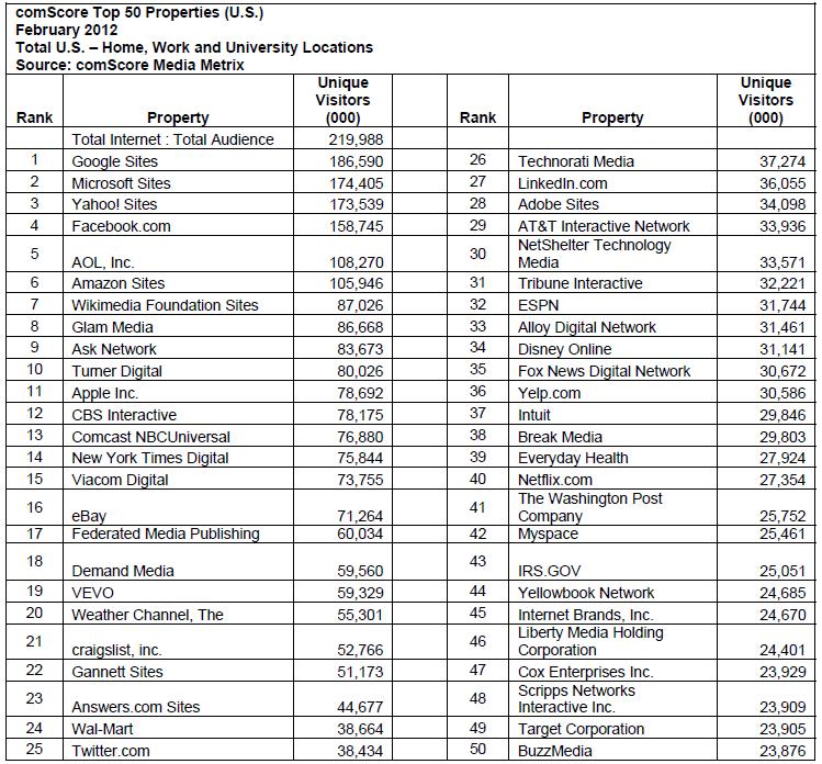 (Table: comScore Media Metrix top 50 properties in America, February 2012)