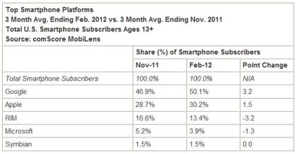 Kembali ke pangsa pasar telepon pintar di Amerika, sejak iPhone model 4S diluncurkan seminggu setelah kematian Steve Jobs pada bulan Oktober lalu, Apple iOS terus meraih pangsa pasar lebih besar. Perusahaan yang berbasis di kota Cupertino, Silicon Valley, California ini berada di peringkat kedua dengan pangsa pasar 30,2%, dibandingkan bulan Nopember lalu Apple hanya meraih 28,7% pangsa. Ini ada peningkatan sebesar 1,5 persen.