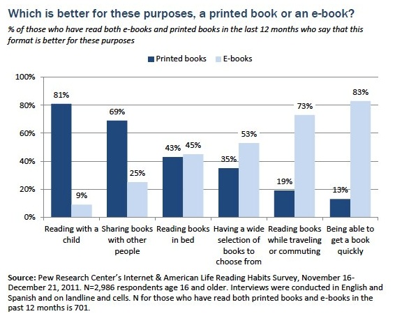 Dengan bantuan dana dari Bill & Melinda Gates Foundation, Pew Research Center melakukan survei terhadap 2.986 orang Amerika usia 16 keatas, yang dilakukan mulai tanggal 16 Nopember dan berakhir pada tanggal 21 Desember 2011.  Menurut survei dari Pew Research Center, sejak awal tahun 2012 ini 21% orang Amerika sudah pernah memakai perangkat baca elektronik seperti Kindle, Nook, dan iPad.  Hasil survei dari Pew Research Center menyatakan bahwa kemudahan untuk membeli, men-download e-konten mendorong orang Amerika untuk membaca lebih banyak dan malah semakin konsumeris dengan membeli buku lebih banyak daripada meminjamnya di perpustakaan.  Pemakai perangkat e-book membaca 24 buku tahun lalu, dibandingkan hanya 15 buku cetak dari mesin percetakan. Laporan dari Pew Research Center juga menyatakan bahwa 30% dari pembaca e-konten lebih banyak meluangkan waktu untuk membaca, terutama pemilik iPad dan e-book lebih suka memakai perangkat elektronik mereka untuk membaca lebih banyak konten dari biasanya.