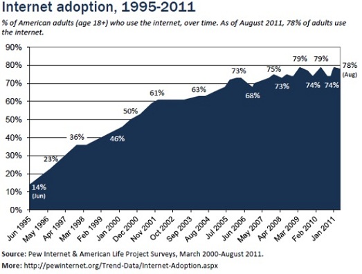Berdasarkan hasil survei atas 2.260 orang dewasa usia 18 keatas di Amerika yang dilakukan melalui telepon darat dan ponsel dari tanggal 25 Juli sampai 26 Agustus, 2011, Pew Internet & American Life Project menerbitkan sebuah laporan mengenai akses Internet di Amerika. Jumlah pengguna Internet di Amerika mencapai 73% pada tahun 2005, dan terus stabil antara 75% sampai 79% dalam kurun waktu beberapa tahun kemudian, dan masih tetap di 78% pada bulan Agustus tahun lalu. Dengan kata lain, laporan ini menemukan masih ada satu dari lima orang dewasa di Amerika tidak memiliki akses ke Internet pada tahun 2011.