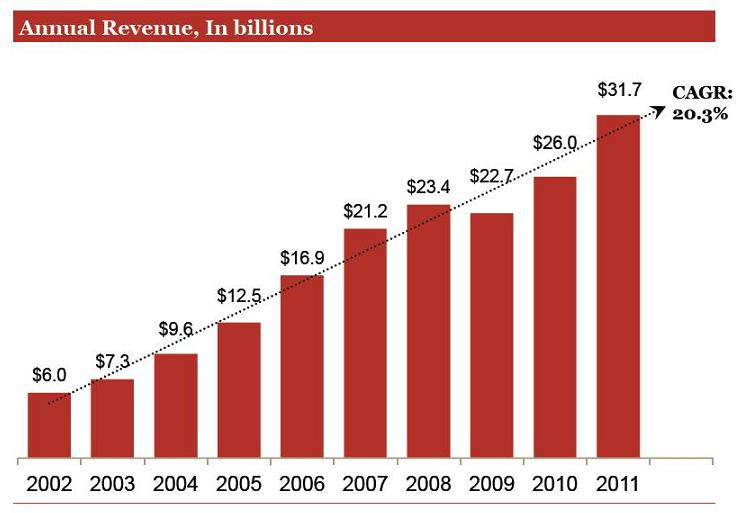 Sedangkan kalau dilihat secara kuartal, maka kuartal ke-4 tahun 2011 menghasilkan total $8.97 milyar. Ini berarti ada kenaikan sebesar 14,7 persen dari kuartal ke-3 tahun 2011 yang mana total pendapatan pada kuartal tsb mencapai jumlah $7.82 milyar. Kalau kita melihat perbandingan berdasarkan empat kuartal, pendapatan kuartal ke-4 tahun 2011 meningkat 20,4% dari kuartal ke-4 tahun 2010 yang jumlahnya adalah $7.45 milyar.