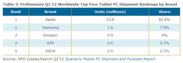 Yang menduduki urutan nomer dua untuk jenis tablet dengan jarak yang sangat jauh dari iPad adalah Samsung yang terkenal dengan Galaxy Tab. Perusahaan Korea Selatan ini berhasil mengirimkan sebanyak 1,6 juta unit dan mengambil 7.5% dari pangsa pasar. Amazon Kindle Fire yang diluncurkan pada hari Thanksgiving bulan Nopember tahun lalu mengambil 4% pangsa pasar dan raja ecommerce berhasil mengirim 900 ribu unit. RIM BlackBerry hanya berhasil mengirimkan sebanyak 500 ribu unit PlayBook pada kuartal lalu dan hanya mengambil pangsa 2.3 persen. Walaupun sempat digembar-gemborkan sebagai perangkat yang bagus dengan banyak fitur, ternyata Barnes & Noble Nook tidak masuk top lima besar dalam urusan pengiriman komputer pribadi jenis tablet pada kuartal pertama 2012.
