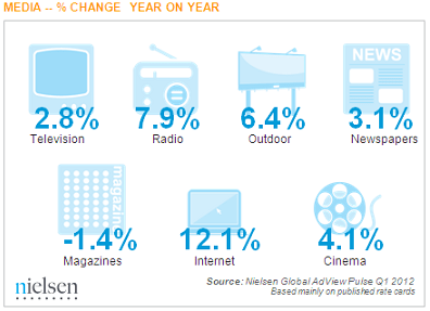Menurut data kuartal pertama 2012 yang dipublikasikan oleh Nielsen Global AdView Pulse, pemasang iklan menghabiskan biaya lebih banyak dan meningkat lebih dari 12,1 persen pada kuartal pertama 2012 dibandingkan dengan kuartal yang sama satu tahun yang lalu. Padahal untuk kuartal pertama 2012, secara keseluruhan dalam skala global biaya iklan hanya meningkat 3,1 persen dari satu tahun yang lalu.