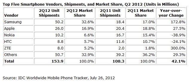 Dalam hal pemasaran produk, Samsung strategi berbeda dengan Apple. Samsung mengandalkan beberapa produk untuk menargetkan segmen pasar yang luas, mulai dengan model Samsung Galaxy S II dan S III, sampai telepon berlayar lebar Galaxy Note atau juga dikenal sebagai “Phablet” (phone + tablet). Phablet Galaxy Note yang diperkenalkan menjelang akhir tahun 2011 dengan tambahan sebuah pena stylus sangat laku di benua Asia terutama untuk pengguna yang menulis huruf kanji (China, Jepang, Korea) dan huruf arab (Timur Tengah). Dengan bantuan sistem operasi Google Android, perusahaan Korea Selatan ini juga terus merilis model baru. Samsung berhasil mengirim 50,2 juta unit telepon pintar pada kuartal kedua 2012, dibandingkan hanya 18,4 juta unit pada kuartal yang sama satu tahun sebelumnya. Ini terjadi peningkatan sebanyak 172,8% dari tahun-ke-tahun. Samsung berhasil meraup 32,6% pangsa pasar ponsel pintar di seluruh dunia pada kuartal kedua 2012, dibandingkan pangsa 17,0% satu tahun yang lalu.