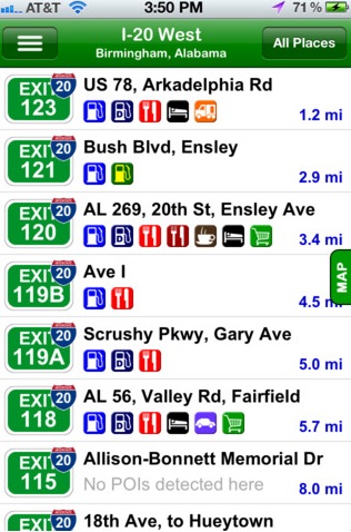 Saat menyetir di jalan highway atau interstate dengan kecepatan tinggi, pengemudi seringkali tidak sempat melihat semua rambu yang menunjukkan fasilitas- fasilitas yang tersedia sebelum mencapai pintu keluar berikutnya. Kalau menggunakan GPS, alat ini hanya memberitahu bagaimana caranya menuju ke suatu lokasi. Sedangkan aplikasi iExit akan memberitahu pengemudi di mana saja tempat-tempat menarik untuk berhenti di sepanjang perjalanan. Aplikasi iExit akan menunjukkan layanan dan tempat termasuk lokasi hotel, restoran fast-food, pompa bensin, supermarket, tempat istirahat, tempat wisata, dan lain sebagainya.