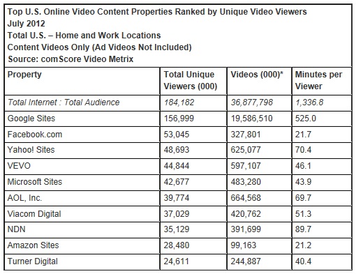 Berdasarkan data bulanan yang dipublikasikan oleh comScore Video Metrix, jumlah pemirsa video online di Amerika mencapai 184.2 juta pemirsa pada bulan Juli 2012. Dari sekian banyaknya penonton, mereka menonton sebanyak 36.9 miliar video selama satu bulan. Penyelenggara konten video terbesar masih dikuasai oleh Google Sites yang juga sebagai pemilik situs YouTube. Situs properti dari mesin pencari terbesar didunia ini menayangkan berbagai macam video termasuk cuplikan Olimpiade 2012 dari kota London, menerima sekitar 157 juta pemirsa. Situs video terbesar ini memutar sebanyak 19.6 miliar video pada bulan Juli.