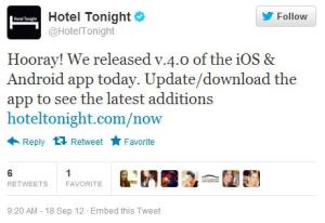 (Images: top right, HotelTonight iTunes app logo; middle right, Twitter update; bottom left, HotelTonight iPhone app)