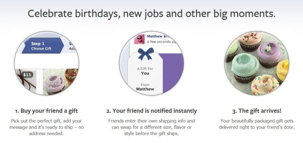 Semua orang senang menerima kado, demikian juga pengguna jaringan sosial ketika menerima pesan dari teman-teman yang muncul di dinding Facebook mereka dengan ucapan “Selamat Ulang Tahun,” “Ultah,” “Selamat Bertunangan,” “Selamat Melahirkan,” “Selamat Mendapatkan Pekerjaan Baru,” “Selamat Lulus Sekolah,” dan “Selamat …” Bagi pengguna Facebook, menerima ucapan “Selamat” dalam bentuk virtual terasa masih kurang lengkap kalau tidak ditambah dengan hadiah nyata. Maka tim kerja Facebook melihat peluang untuk menyenangkan hati si penerima ucapan “Selamat” dan potensi memasarkan fitur baru ini kepada 950 juta pengguna dengan menambahkan hadiah yang bisa disentuh dan bisa dilihat mata.