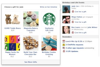Fitur baru yang diperkenalkan minggu ini dikenal dengan sebutan “Gifts” (kado, hadiah). Sebagai jaringan sosial terbesar didunia, Facebook seolah-olah bertindak sebagai toko online khusus menyediakan berbagai bentuk kado untuk pengguna. Facebook bermitra dengan pemasok hadiah termasuk perusahaan kedai kopi Starbucks dan beberapa perusahaan roti.