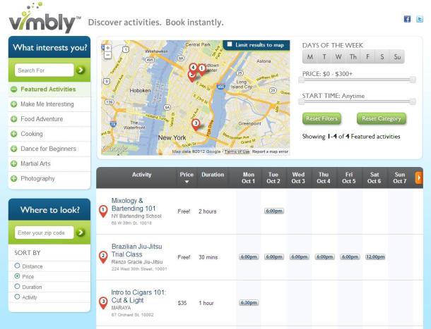 Sebuah situs web telah diluncurkan di kota New York City, aplikasi web yang dikenal dengan nama Vimbly, dimana aplikasi ini memberikan kenyamanan kepada pengguna menemukan aktivitas favorit dan memudahkan proses perencanaan kegiatan sehari-hari setelah jam kantor dan mengisi acara akhir minggu. Supaya tidak membingungkan pemakai, situs ini dibuat sangat sederhana. Di halaman utama di pasang sebuat peta lokal, dengan pemisahaan fitur berdasarkan jadwal dari hari Senin sampai Minggu, daftar harga dengan batas harga tertinggi dan terendah (kadang-kadang kursus diberikan gratis), dan jam kegiatan dimulai. Di bagian tengah halaman, dipasang tabel hasil dari pencarian dengan limitasi yang ditampilkan dalam bentuk kelender, yang terbagi atas kolom “nama aktivitas,” “harga,” dan “jumlah waktu.” Kalau pengguna sudah setuju dengan aktivitas di tabel tsb, mereka diperbolehkan memesan langsung dan membayar dengan kartu kredit atau menggunakan alat pembayaran online sejenis PayPal.