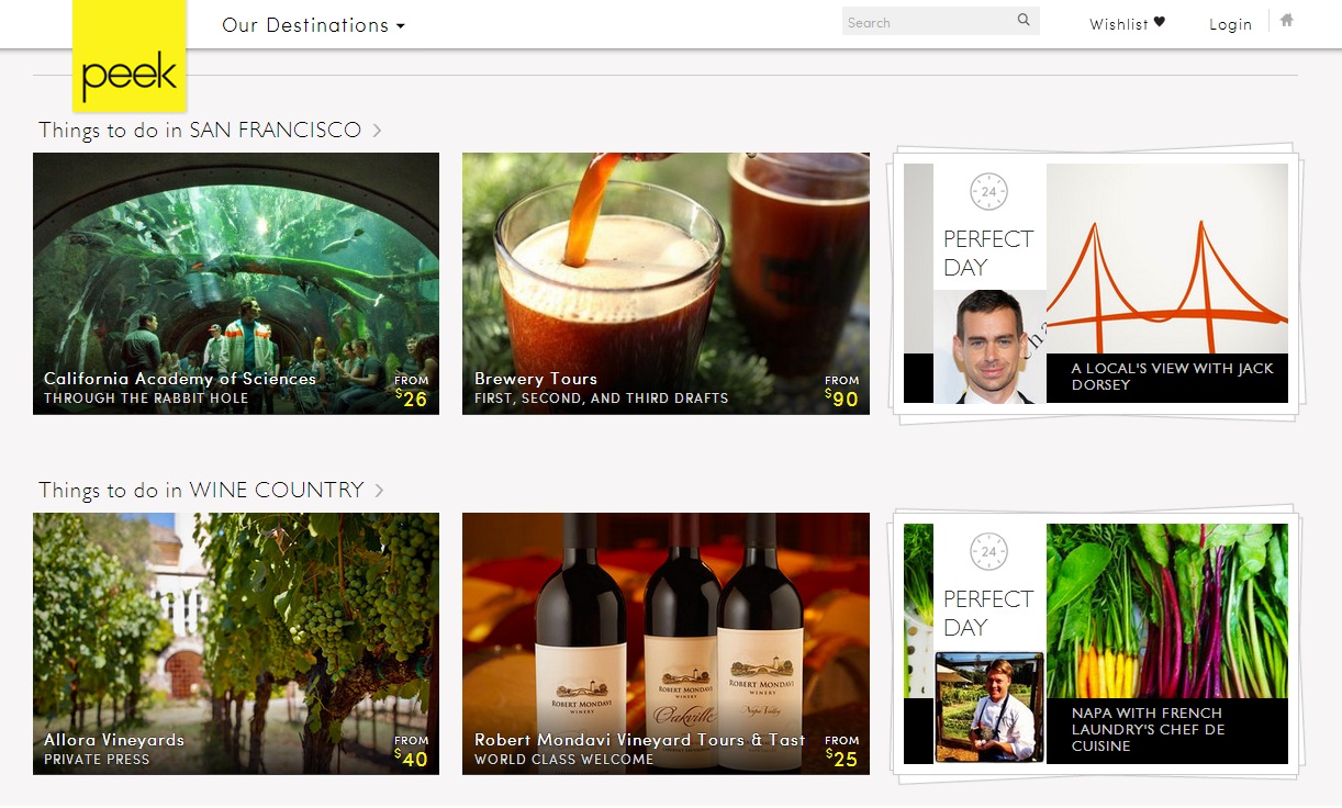 Jadi terlepas dari mencari akomodasi dan informasi penerbangan, para pelancong juga sering mencari kegiatan baru yang dapat dilakukan dan mendaftarkan kegiatan tsb. Kehadiran Peek bertujuan untuk mengisi kekurangan yang terjadi di dunia travel. Peek ingin membantu pelancong yang melakukan perencanaan perjalanan dan memuaskan para pelancong dengan menyediakan situs berupa toko satu-kali-stop. Keunikan Peek terletak di tampilan yang menggunakan fotografi cantik dan dibantu dengan ulasan singkat mengenai kegiatan yang dapat dilakukan di suatu kota, sekaligus berfungsi sebagai tempat pendaftaran. Keunggulan Peek termasuk dalam hal mencetak uang dengan cara mengambil komisi antara 15 sampai 30 persen untuk setiap transaksi yang dilakukan oleh pengguna melalui situs web ini. Keunggulan lainnya terletak di kolaborasi dengan usaha kecil, Peek bertindak sebagai penyedia layanan aktivitas lokal (misalnya, perjalanan naik pesawat helicopter keliling kota, penjalanan mencoba minuman anggur, dan lain sebagainya), dimana usaha kecil semacam itu masih belum memiliki kehadiran di web yang kuat.