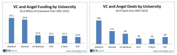 Laporan CB Insights menyatakan bahwa para alumni perguruan tinggi terkemuka telah menerima pendanaan sebanyak $12.6 miliar untuk pembiayaan 559 transaksi. Tidak mengherankan kalau laporan ini menyatakan Stanford yang berbasis di kawasan Silicon Valley berada di posisi nomor satu untuk urusan penawaran dan pendanaan dibandingkan dengan alumni perguruan tinggi terkemuka lainnya. Para alumni Stanford telah berhasil menarik minat investasi sebesar $4.1 miliar dan melakukan 203 kali pendanaan.