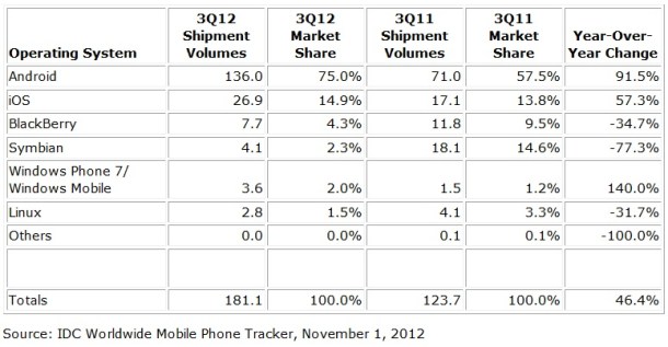 Pada kuartal ketiga, periode Juli s/d September 2012, jumlah ponsel pintar (smartphone) yang dikirim ke seluruh dunia mencapai 181,1 juta unit, ini berdasarkan data yang dipublikasikan oleh International Data Corporation (IDC) Worldwide Quarterly Mobile Phone Tracker. Dibandingkan satu tahun yang lalu, jumlah ponsel pintar yang dikirim baru mencapai 123,7 juta unit. Jadi pertumbuhan pasar dari tahun-ke-tahun adalah 46,4 persen.
