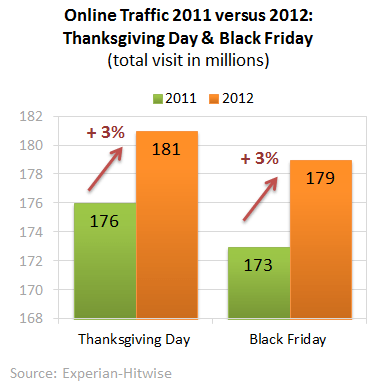 Sehari setelah Thanksgiving Day dikenal dengan julukan Black Friday, Experian-Hitwise mempublikasikan data lalu lintas online untuk hari belanja terbesar untuk tahun 2012. Lalu lintas online Black Friday 2012 yang diterima oleh 500 situs web besar menembus 179 juta kunjungan, dibandingkan dengan 173 juta kunjungan pada hari Black Friday tahun 2011. Ini terjadi peningkatan sebanyak 3,5 persen dalam waktu satu tahun.