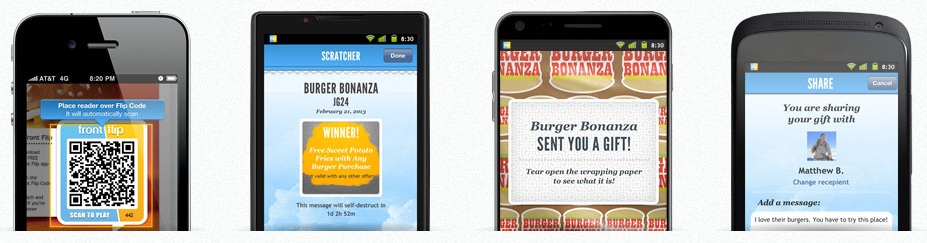 Cara kerjanya sangat mudah, dimana setiap pengguna dapat men-download aplikasi Front Flip untuk perangkat mobile yang dijalankan iOS (iPhone dan iPad) dan Android. Dengan aplikasi ini, pengguna dapat men-scan Flip Kode (seperti kode QR) ketika mengunjungi restoran dan toko pengecer yang berpartisipasi dan membuka semacam kartu digital untuk memenangkan hadiah secara instan atau diskon besar di tempat. Restoran dan toko pengecer juga dapat mengirimkan hadiah atau diskon ke ponsel pelanggan, dimana mereka dapat berbagi dengan teman-teman atau anggota keluarga. Keuntungan bagi pengguna aplikasi termasuk menghemat uang belanja dan memenangkan hadiah yang mencengangkan dengan cara instan.