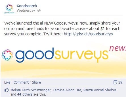 Setelah menyediakan layanan mesin pencari dan untuk belanja, pada hari Rabu, 20 Februari 2013, Goodsearch meluncurkan layanan baru yang dinamakan Goodsurveys. Tujuan dari layanan baru ini memberikan kemudahan bagi pengguna Internet berbagi pendapat dengan mengambil survei online. Ibarat menjalankan tugas menjawab beberapa pertanyaan sambil mengumpulkan sumbangan amal.