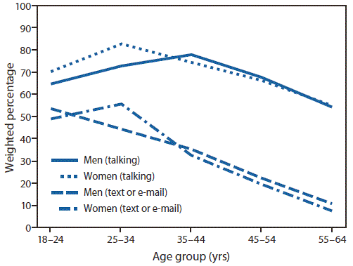 Pengemudi dari dua kelompok usia, dewasa muda (18-24 tahun) dan dewasa (25-34 tahun), adalah pengemudi yang suka berbicara di ponsel dan membaca atau mengirim teks SMS ketika sedang mengemudi. Data juga menunjukkan bahwa ada sedikit perbedaan berdasarkan jenis kelamin. Wanita kelompok usia dewasa (25-34 tahun), cenderung lebih suka bercakap di ponsel dan mengirim teks, dibandingkan dengan pria pada kelompok usia yang sama.