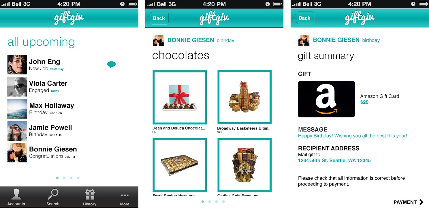 (Images: top right, GiftGiv logo; middle, GiftGiv iOS app screenshot via Facebook photo album; bottom, click here to watch a video demo)