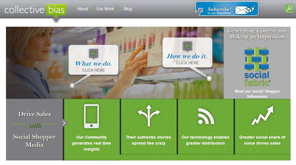 Collective-Bias-homepage-screenshotStartup Collective Bias menawarkan layanan menciptakan konten dalam bentuk kisah-kisah nyata bagi pemegang merek, supaya mereka bisa berhubungan dengan pembeli. Konten diproduksi oleh tim kerja Collective Bias dengan menyambung pendapat dari konsumen dan orang-orang berpengaruh. Cerita-cerita bagus dan menarik kemudian disebarluaskan ke masyarakat dan mempengaruhi media sosial dan mengoptimalkan pencarian suku kata melalui mesin pencari. Berangsur-angsur konten semacam itu dipakai pemasar untuk meningkatkan penjualan dan pengenalan merek.