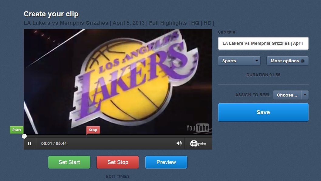 (Images: top right, ReelSurfer logo; bottom, ReelSurfer “Create your clip” screenshot showing Lakers game)