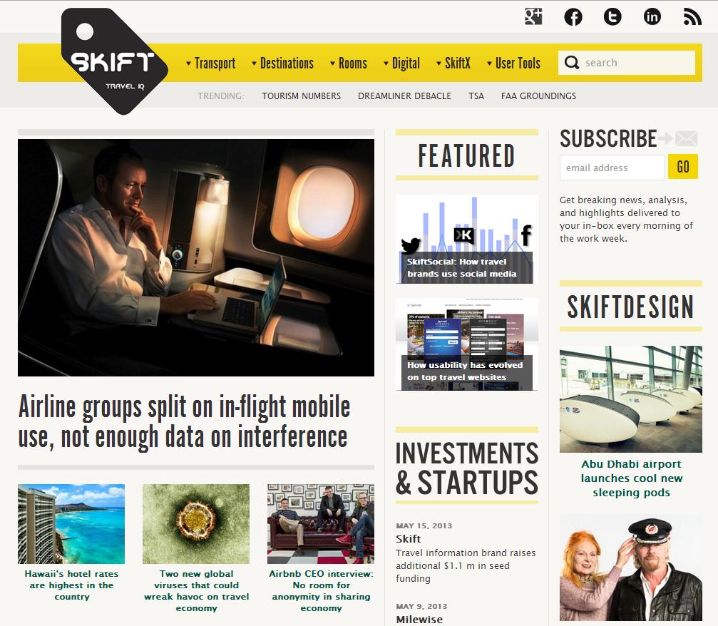(Images: top right, Skift logo; bottom, Skift homepage screenshot)