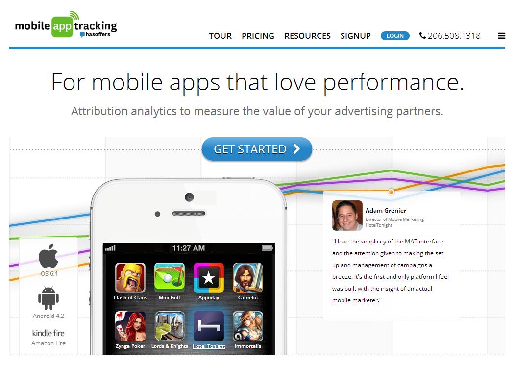 (Images: top right, HasOffers logo; bottom, MobileAppTracking.com homepage screenshot)