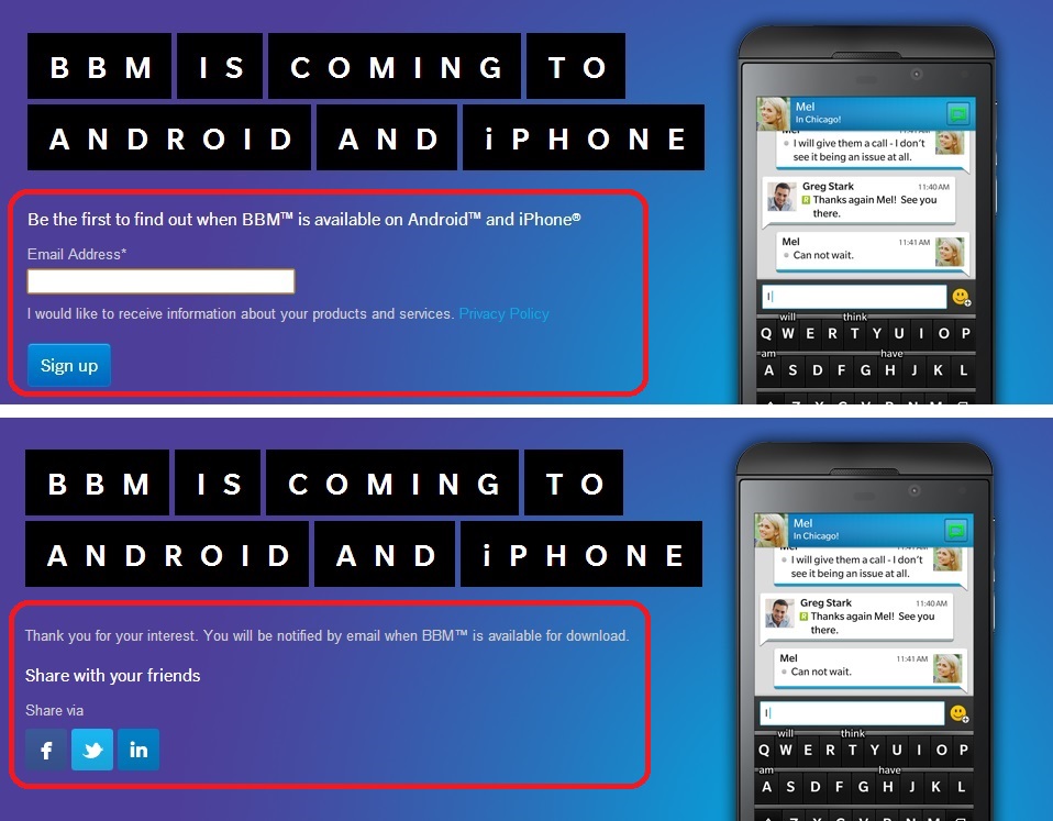 (Images: top right, BBM cross-platform via BlackBerryOS.com; bottom, (top) BBM cross-platform registration form, (bottom) BBM cross-platform thank you page)