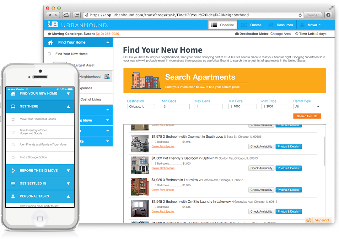 Perusahaan startup UrbanBound yang didirikan pada tahun 2010 di kota Chicago menyediakan platform berbasis web dan seluler untuk memberikan kemudahan kepada perusahaan khususnya kepada departemen SDM mengelola seluruh proses relokasi pekerja mereka. UrbanBound menghubungkan perusahaan dengan tempat penyewaan pengangkutan (truk), jasa agen yang mengurus penyewaan rumah, condo, apartemen, dan layanan lainnya yang karyawan butuhkan selama relokasi. UrbanBound juga menyediakan alat untuk mencatat jumlah pengeluaran supaya sesuai dengan anggaran dan menyediakan informasi lengkap tentang lokasi baru yang memudahkan karyawan melakukan transisi lebih efisien.