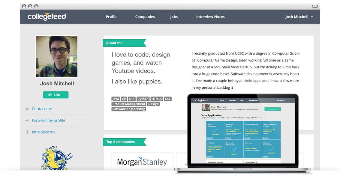(Images: top right, Collegefeed logo via Facebook; bottom, Collegefeed’s homepage, showing a sample of student profile)