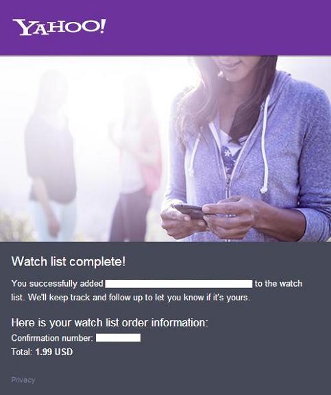 (Images: top right, Yahoo! Watch List “complete” confirmation of order via email; bottom, Yahoo! Watch List homepage)