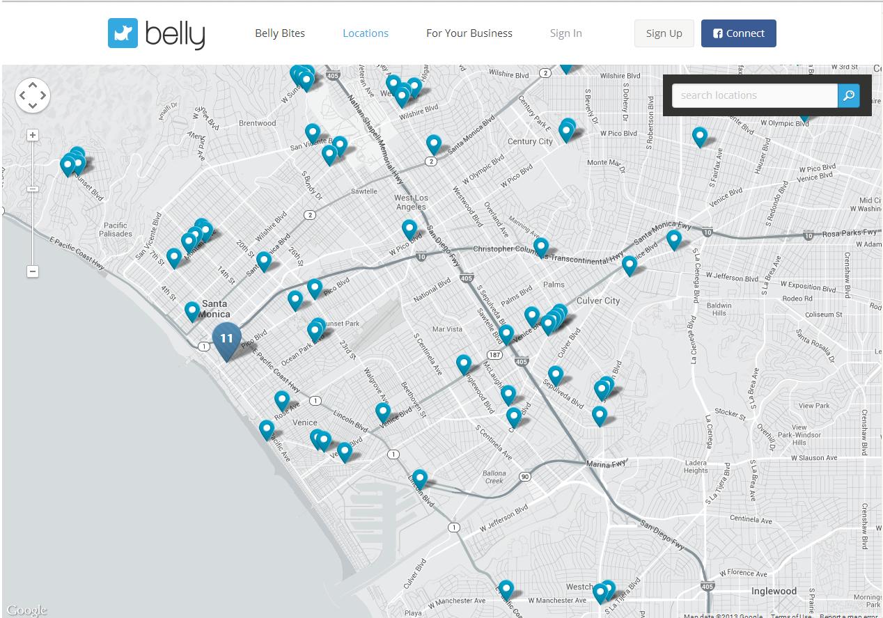 (Images: top right, Belly logo; middle, Belly Card iPad at a store via Facebook; bottom, a map showing Belly Card Locations in West Los Angeles)