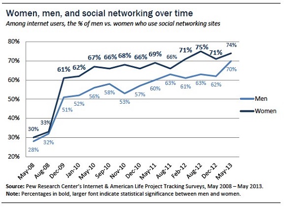 Menurut hasil penelitian dari lembaga riset terkemuka Pew, wanita di Amerika lebih sering menggunakan situs media sosial daripada pria. Perbedaan proporsi jumlah pengguna jaringan sosial antara wanita dan pria mencapai rata-rata 10 persen sejak akhir tahun 2009 sampai akhir tahun 2012. Akan tetapi survei terakhir yang dilakukan pada bulan Mei 2013 menunjukkan bahwa perbedaannya tsb. sudah mendekati 4 persen.