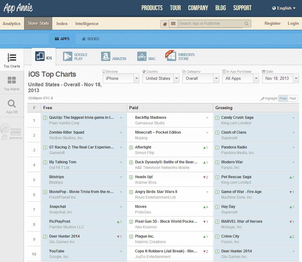 (Images: top, App Annie iOS Top Charts for the week of November 18, 2013; bottom, QuizUp iOS app via homepage)