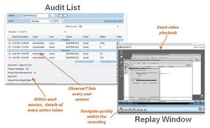 Untuk menanggulangi tindak kejahatan yang dilakukan oleh pengguna ketika mengakses Internet dan situs web, perusahaan besar menempatkan prioritas tinggi pada keamanan. ObserveIT memungkinkan petugas IT manajer untuk mengetahui siapa saja yang datang mengunjungi server milik perusahaan, apa saja yang mereka lakukan ketika berkunjung, dan kapan saja mereka datang ke server. Informasi perilaku pengguna dikumpulkan dalam bentuk rekaman video yang sangat berharga ketika IT manajer melakukan audit, seolah-olah seperti kamera keamanan yang terus menerus merekam video terhadap pengunjung di bank.