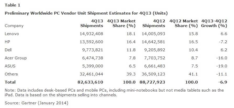 Bagi pabrik komputer pribadi (PC), tahun 2013 merupakan tahun yang sangat sulit dalam hal penjualan, akan tetapi penjualan pada tahun 2014 diperkirakan akan membaik. Laporan terbaru dari perusahaan riset Gartner menunjukkan bahwa pengiriman PC turun 6,9 persen di seluruh dunia pada kuartal keempat 2013, dibandingkan dengan kuartal yang sama tahun 2012. Gartner menyatakan penurunan penjualan PC pada tahun 2013 merupakan yang terburuk dalam sejarah.