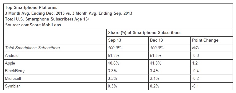 (Image: bottom, top smartphone platforms ending December 2013 by comScore MobiLens)