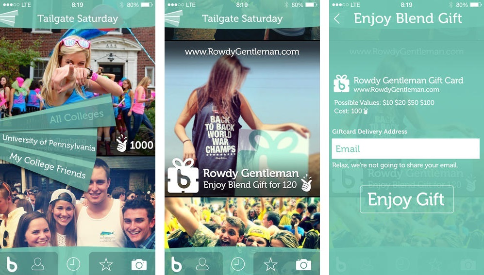 Blend adalah aplikasi khusus untuk mahasiswa di perguruan tinggi. Aplikasi ini memungkinkan mahasiswa berbagi pengalaman unik di bangku kuliah. Mahasiswa berbagi tren yang terjadi pada hari tertentu, misalnya berbagi foto yang berkaitan dengan tema hari penting. Kemudian mahasiswa menerima respon (dalam bentuk poin atau snaps) dari teman-teman di jaringan sosial mereka. Apabila sudah mengumpulkan banyak poin, maka siswa dapat menukarkannya dengan barang gratis dari merek terkemuka.