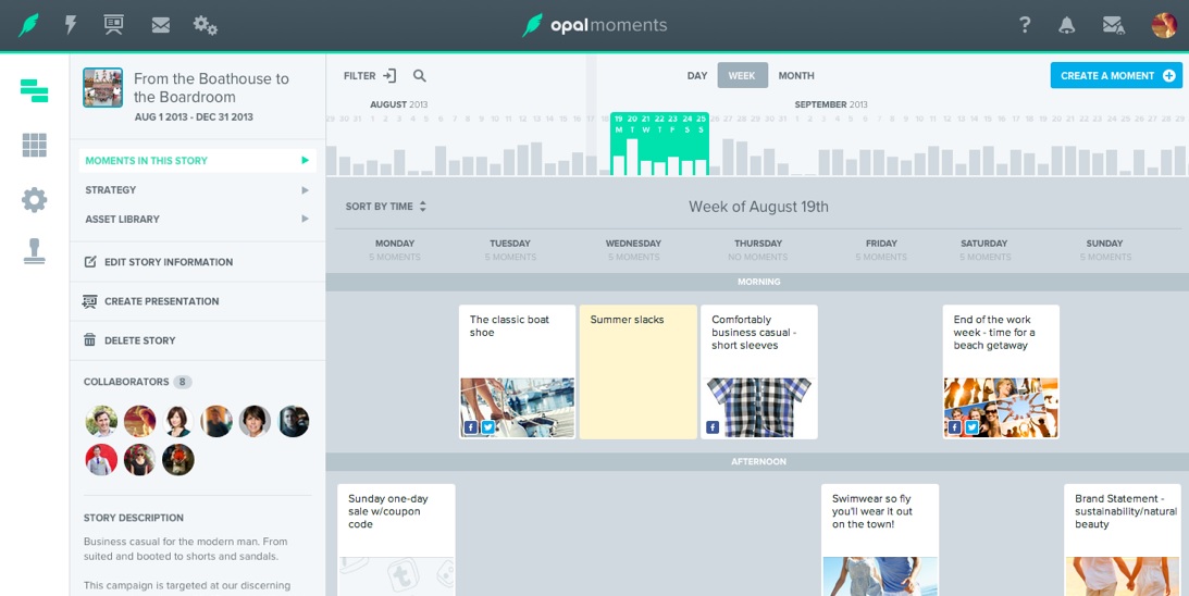 Opal Labs sudah mengembangkan perangkat lunak yang dikenal sebagai Opal Moments, dimana dipakai untuk membantu merek terkemuka untuk merencanakan dan mengelola konten yang akan dipasang melalui jaringan sosial. Semua perencanaan, konten untuk media sosial, dan kalender visual disimpan di cloud (awan) sehingga memungkinkan satu tim kerja (misalnya, tim pemasaran) untuk berkolaborasi dan berkomunikasi dari seluruh penjuru dunia.