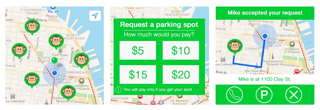 (Images: top middle, MonkeyParker app; bottom, MonkeyParking app for San Francisco)