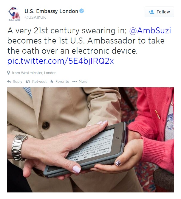 Sekarang giliran duta besar baru negara adikuasa Amerika untuk negara Swiss dan Liechtenstein, Suzi LeVine, memakai sebuah e-reader yang berisi salinan Konstitusi Amerika ketika di ambil sumpah jabatan oleh wakil presiden Joe Biden pada akhir bulan Mei 2014. Suzi LeVine merupakan pejabat kementerian luar negeri pertama yang mengambil sumpah jabatan diatas perangkat elektronik Kindle.