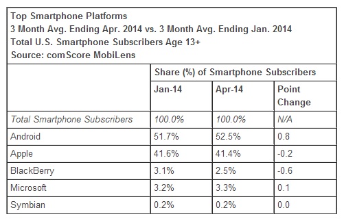 Laporan bulanan comScore untuk pangsa pasar ponsel pintar bulan April 2014 di Amerika sudah dipublikasikan awal minggu ini. System operasi Google Android masih berada di peringkat pertama sebagai platform ponsel pintar yang paling disukai pengguna di Amerika. Android mengambil pangsa pasar sebesar 52,5 persen pada bulan April, dibandingkan dengan 51,7 persen pada bulan Januari, atau terjadi kenaikan sebanyak 0,8 poin persentase.
