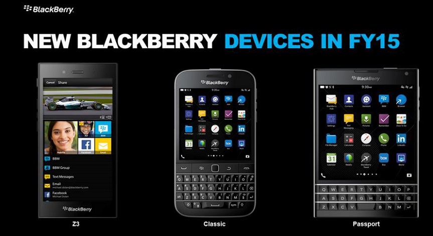 (Images: top right, CEO John Chen holding a BlackBerry Passport and a Classic via crackberry.com; bottom, comparing BlackBerry Z3, Classic, and Passport)