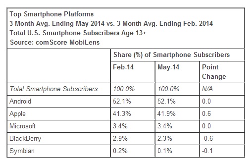 Perusahaan riset terkemuka comScore, Inc. kembali mempublikasikan laporan bulanan tentang pangsa pasar ponsel pintar (smartphone) platform di Amerika. comScore menyatakan bahwa sudah ada 169 juta orang di Amerika memiliki ponsel pintar, atau penetrasi pasar sebesar 70 persen sampai akhir bulan Mei 2014.