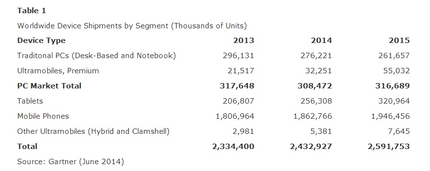 (Image: bottom, Worldwide Device Shipments by Segment, Gartner, June 2014)