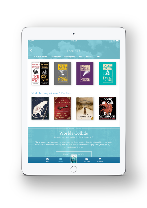 Scribd menawarkan kemudahan akses tak terbatas bagi setiap pelanggan untuk meminjam lebih dari setengah juta e-book dan buku audio. Buku elektronik untuk orang dewasa dan anak-anak. Setiap pelanggan membayar iuran bulanan sebesar $8,99. Keunggulan Scribd dengan menjalin kemitraan dengan dua penerbit terbesar di dunia, yaitu HarperCollins and Simon & Schuster.
