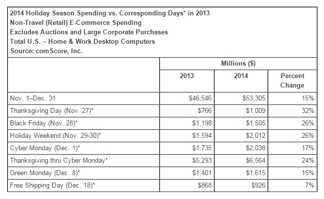 Penjualan e-commerce lewat komputer desktop selama 61 hari untuk musim liburan Hari Natal dan Tahun Baru rata-rata mencapai sekitar $875 juta dollar per hari. Atau dengan kata lain, penjualan online lewat komputer desktop dari hari pertama bulan November sampai hari terakhir bulan Desember 2014, mencapai $53,3 miliar dollar. Dibandingkan bulan November dan Desember 2013, ini terjadi kenaikan penjualan sebesar 15 persen.