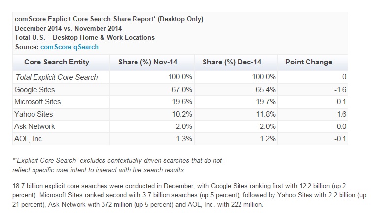 Google masih berada di posisi nomer satu pasar pencarian di Amerika pada bulan Desember dengan mengambil 65,4 persen pangsa pasar (atau, turun 1,6 persen dari November). Pada posisi nomer dua masih dikuasai oleh Bing dengan 19,7 persen (atau, terjadi kenaikan 0,1 persen). Sedangkan portal Yahoo mengambil 11,8 persen (atau, terjadi kenaikan 1,6 persen). Sisanya sekitar 3,2 persen diambil oleh Ask dan AOL.