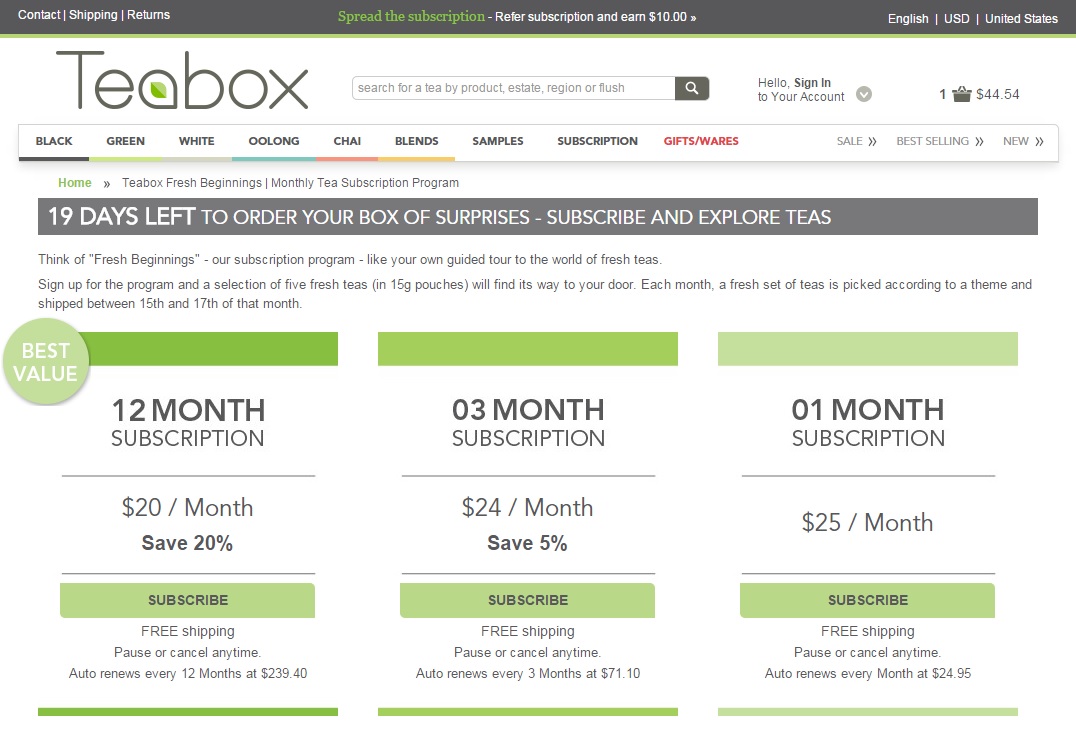 Sedangkan pembeli yang masih ragu-ragu dengan jenis teh yang disukai, mereka dapat memesan teh dengan cara berlangganan. Setiap bulan, tim ahli Teabox memilih beberapa jenis teh terbaru dan kemudian di paket dalam ukuran kecil, dan dikirim dalam sebuah kotak ke rumah pelanggan. Biaya berlangganan minimal $25 dollar per bulan, atau berlangganan selama 12-bulan dengan biaya $240 dollar per tahun.