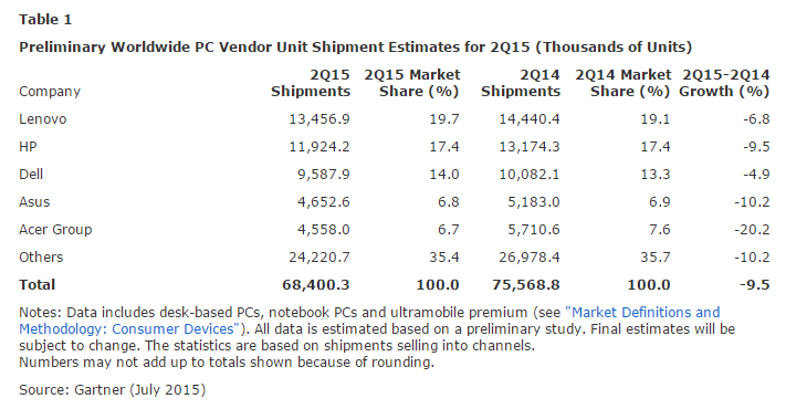 Perusahaan riset Gartner melaporkan bahwa pengiriman komputer pribadi (PC) mengalami penurunan besar pada Q2-2015 (April-Juni) dibandingkan Q2-2014. Dalam waktu 12-bulan terjadi penurunan 9,5 persen dan hanya mencapai 68,4 juta unit. Tapi Gartner percaya bahwa pengiriman PC akan segera pulih kembali, penjualan akan meningkat dan diperkirakan hanya turun 4,4 persen sampai akhir tahun 2015.