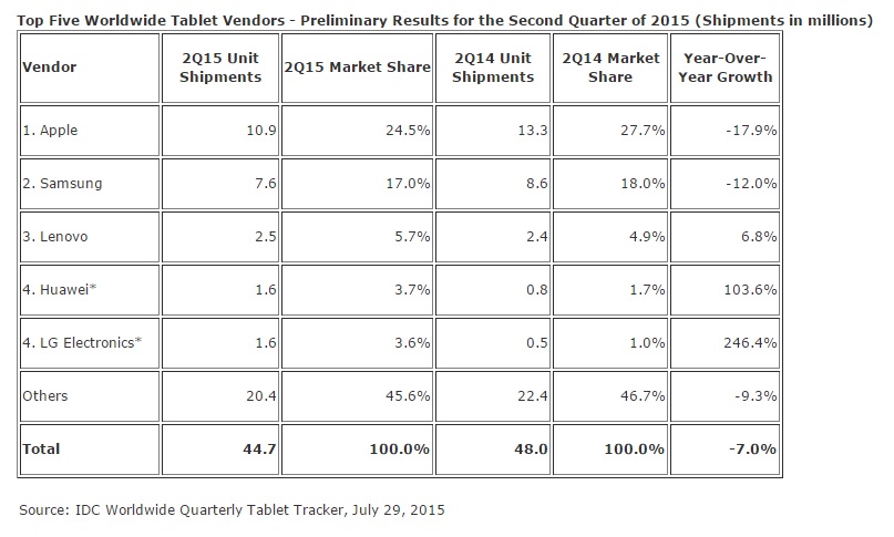 (Image: center, Top Five Worldwide Tablet Vendors by IDC, July 2015)